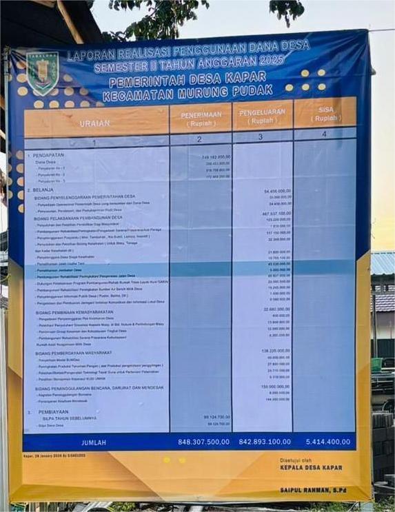 Pemerintah Desa Kapar menunjukkan komitmennya dalam mewujudkan tata kelola pemerintahan yang transparan dan akuntabel dengan mempublikasikan Anggaran Pendapatan dan Belanja Desa (APBDes) Tahun 2026 kepada masyarakat. Publikasi tersebut dilakukan sebagai bentuk penyampaian informasi kepada seluruh warga Desa Kapar.
